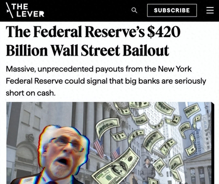 报道中还提到,,美联储还将有4200亿美元的救助计划,纽约联邦储备银行的大规模,前所未有的支付可能表明有大型银行出现了严重的现金短缺。